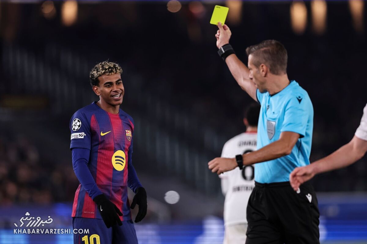 یامال امشب یکی از چهار بازیکن بارسلونا بود که در آستانه محرومیت قرار داشت؛ سه نفر دیگر عبارت بودند از فرانکی دییونگ، مارک کاسادو (نیمکتنشین) و فرمین لوپس (بازیکن فیکس). اما در حالی که بارسا با نتیجه ۲-۱ پیش بود، او در دقیقه ۵۵ به خاطر خطا روی ناتانیل براون، مدافع چپ آلمانی، یک کارت زرد دریافت کرد؛ کارتی که سومین اخطار او در این فصل لیگ قهرمانان محسوب میشود.