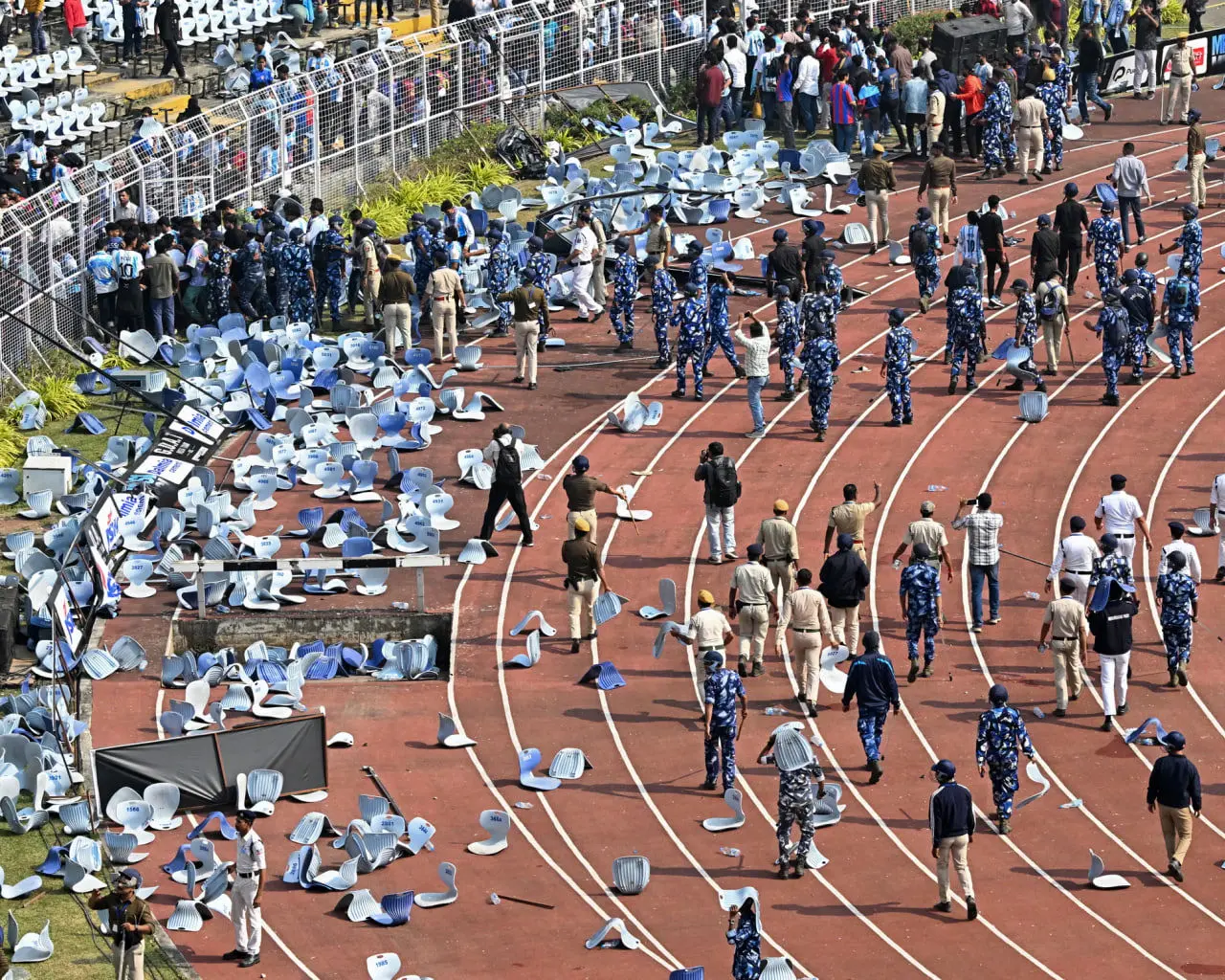 ویدئوهای منتشرشده از سوی ANI نشان میدهد که تعدادی از هواداران با کندن صندلیهای ورزشگاه، آنها را به داخل زمین و پیست دوومیدانی پرتاب کردند. همچنین برخی افراد با عبور از حصار اطراف زمین، اشیای مختلفی را به سمت زمین بازی پرتاب کردند.