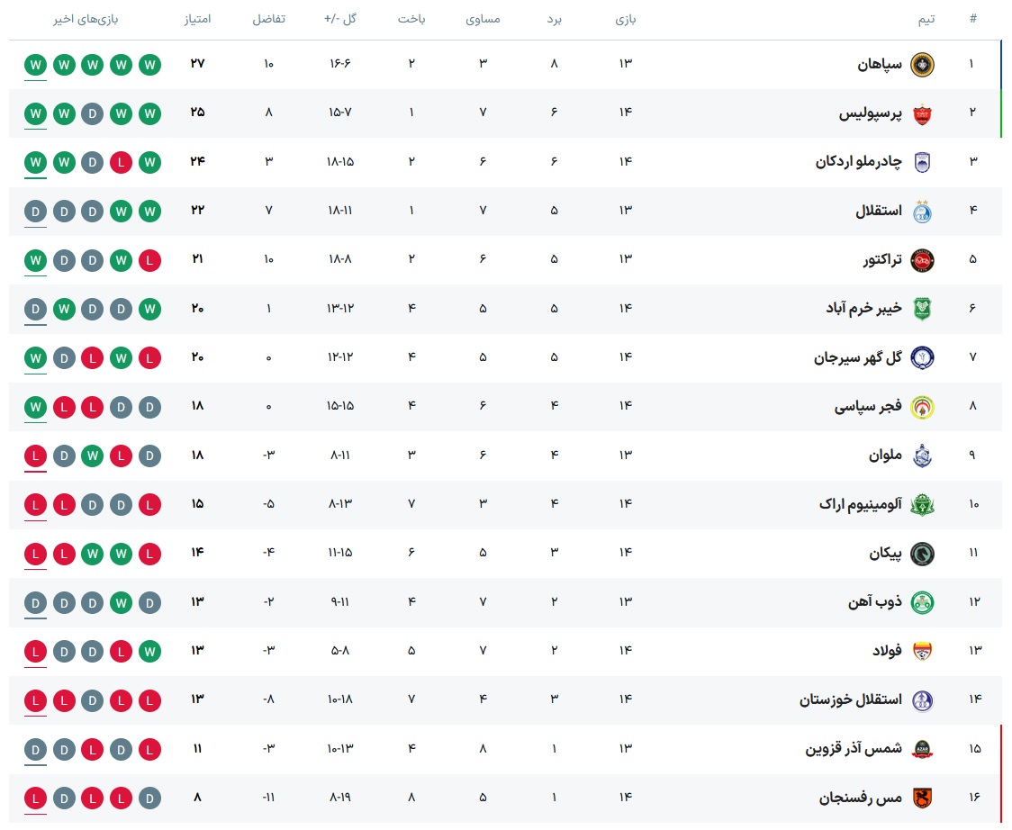 عکس| جدول لیگ برتر در روز دوم هفته چهاردهم