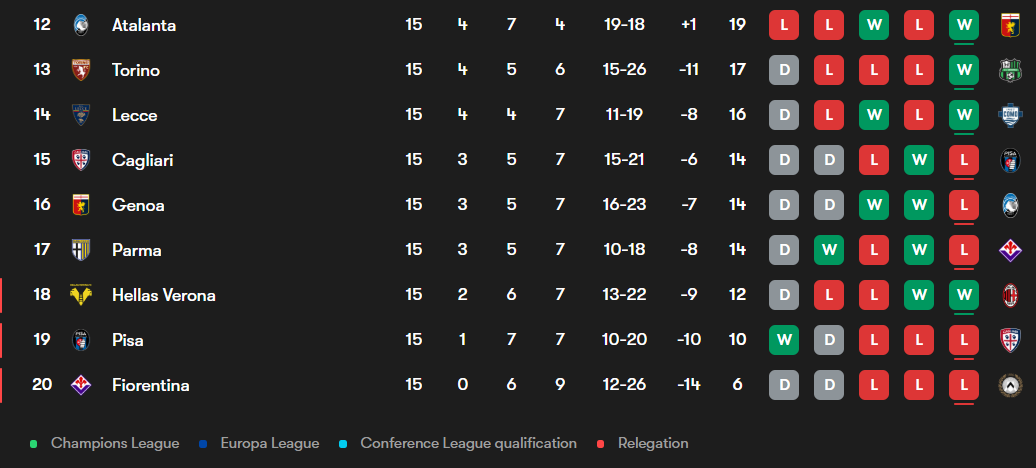 فیورنتینا پس از گذشت ۱۵ هفته از فصل ۲۶-۲۰۲۵ سری آ، در رده بیستم جدول قرار دارد و هنوز هیچ بردی را تجربه نکرده است. این تیم فصل گذشته در همین مقطع (پایان هفته پانزدهم) در رده دوم جدول قرار داشت و در نهایت هم ششم شد تا این فصل در لیگ کنفرانس اروپا حضور داشته باشد.