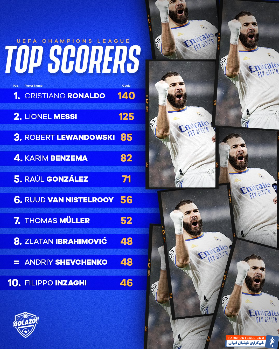 بنزما با این ۳ گل که در شب گذشته به ثبت رساند، تعداد گلهای خود در لیگ قهرمانان اروپا را به عدد ۸۲ رساند تا رقابتی جذاب با لواندوفسکی ایجاد کند.