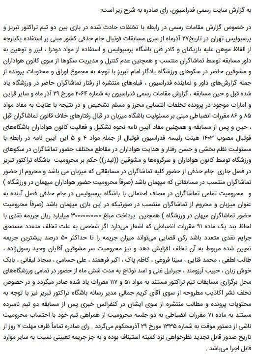 به گزارش تابناک، کمیته انضباطی فدراسیون فوتبال در حکمی بیسابقه و قاطع، رای نهایی خود را در خصوص حواشی جنجالی دیدار تیمهای تراکتور و پرسپولیس رقابتهای جام حذفی اعلام کرد.