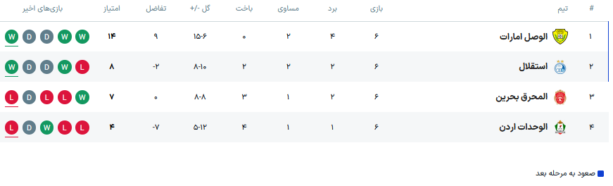 استقلال با این پیروزی هشت امتیازی شد و در رده دوم گروه A قرار گرفت. الوصل امارات پیش از این بهعنوان صدرنشین صعودش را از این گروه قطعی کرده بود.