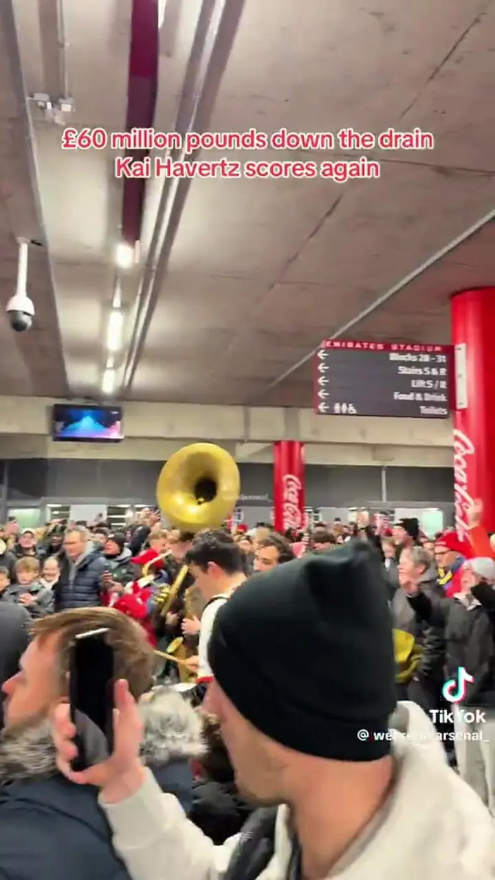 هواداران آرسنال در محوطه داخلی ورزشگاه امارات به همراه یک گروه موسیقی مشغول ایجاد شور و هیجان و تشویق تیمشان هستند.