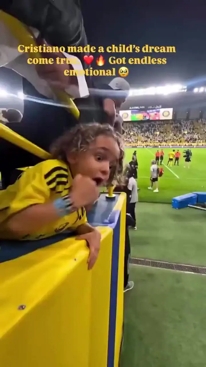 هوادار خردسال باشگاه النصر عربستان پس از استقرار در جایگاه تماشاگران و لحظهای که موفق میشود با کریستیانو رونالدو دست بدهد، از شدت خوشحالی هیجانزده شده و احساساتش را به شکلی پرشور ابراز میکند.