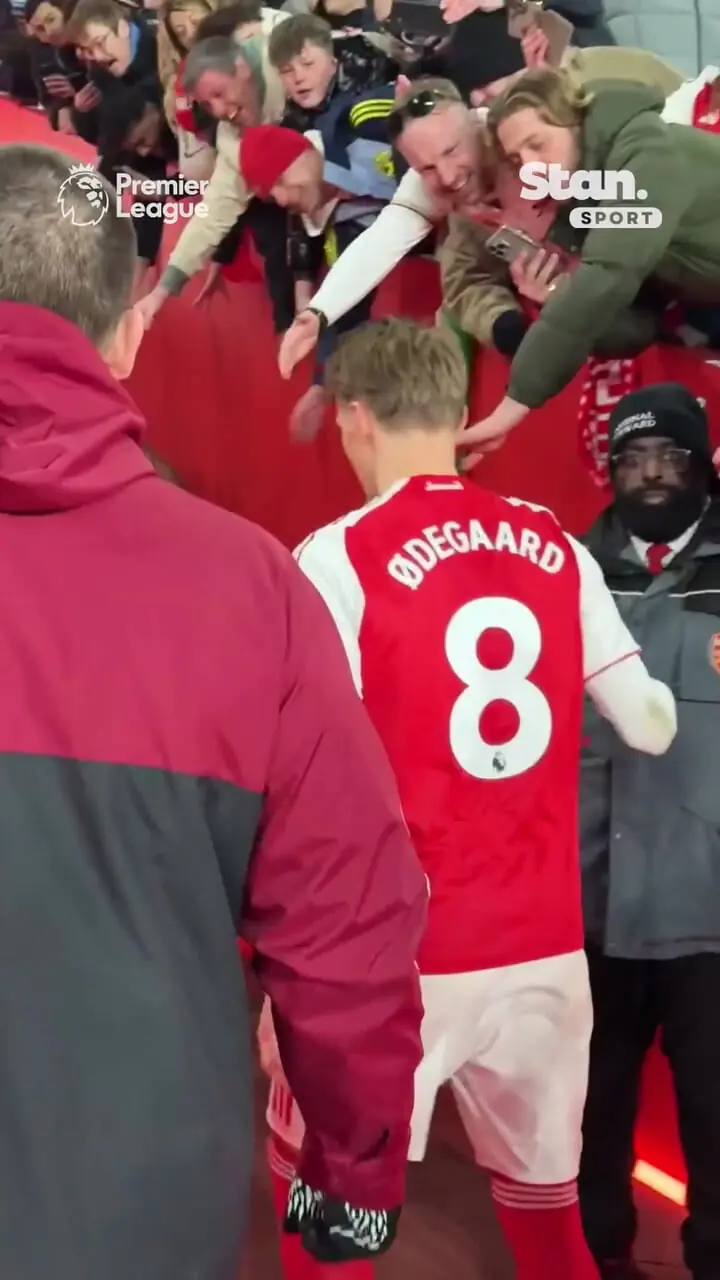 پس از پایان بازی آرسنال و آستون ویلا و برتری ۴ بر یک آرسنال، مارتین اودگارد بازیکن این تیم در مسیر حرکت به تونل ورزشگاه، لباس خود را به یک هوادار هدیه میدهد.