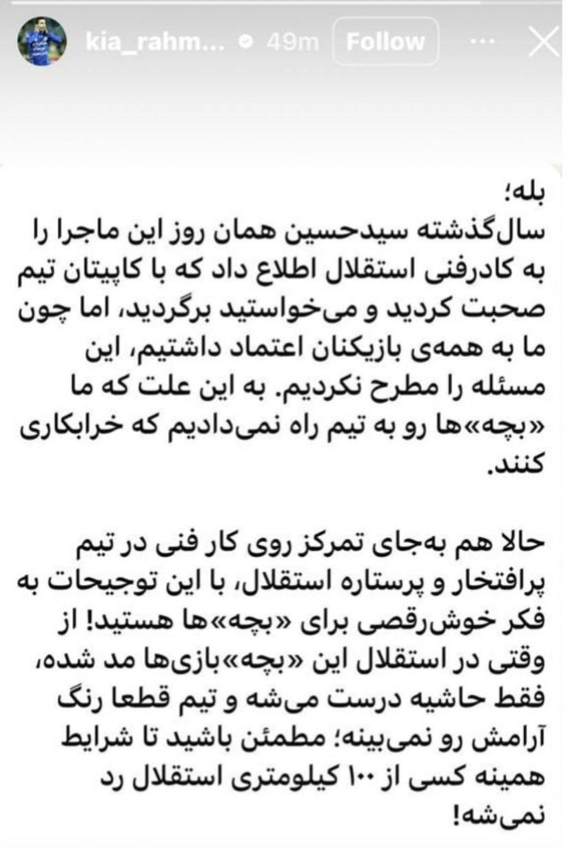 او در پیام خود صراحتاً از واژه «بچه» استفاده کرد که به زعم او، عامل اصلی حواشی و «خرابکاریهای» اخیر در تیم است.