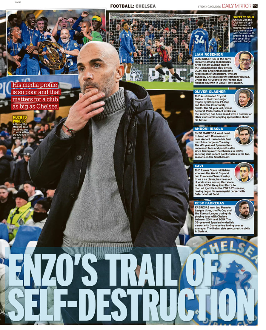 از زمانی که کنسرسیوم تاد بولی-کلیرلیک Clearlake در اواخر می ۲۰۲۲ باشگاه را خرید، آنها شش سرمربی داشتهاند. مالکان توماس توخل را در اختیار گرفتند، اما او ظرف چهار ماه کنار گذاشته شد. گراهام پاتر هفت ماه دوام آورد، برونو سالتور فقط یک بازی و بهطور موقت هدایت تیم را بر عهده داشت، فرانک لمپاردِ موقتا برای ۱۱ مسابقه منصوب شد و مائوریسیو پوچتینو یک فصل روی نیمکت نشست. مارسکا بیش از همه دوام آورد؛ او بیش از یک سال و نیم و در ۹۲ بازی هدایت تیم را به عهده داشت. او دو جام نخست دوران پسا رومان آبراموویچ، لیگ کنفرانس اروپا و جام جهانی باشگاههای فیفا در سال ۲۰۲۵ را فتح کرد و همچنین بعد از دو سال غیبت، چلسی را دوباره به لیگ قهرمانان اروپا بازگرداند. و حالا چلسی باید سراغ فرد دیگری برود.