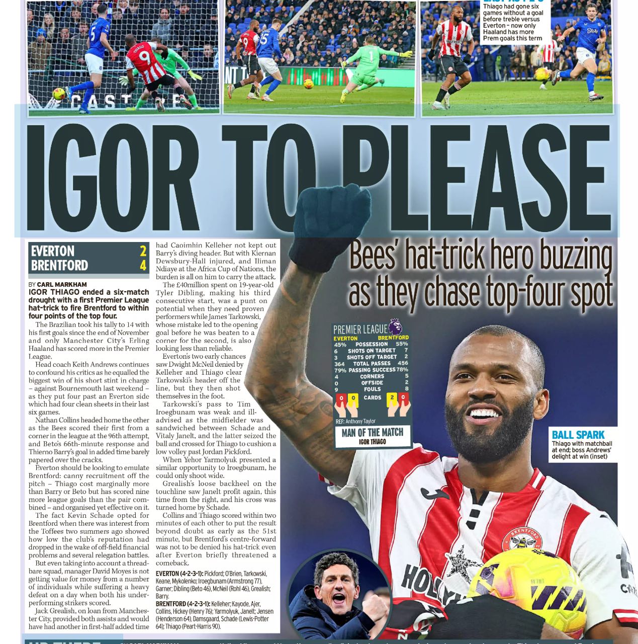 ایگور تیاگو با زدن هتتریک، به بهترین شکل به قحطی کوتاه گلزنیاش پایان داد و برنتفورد با یک پیروزی راحت در ورزشگاه هیل دیکینسون، از اورتون در جدول لیگ برتر پیشی گرفت.