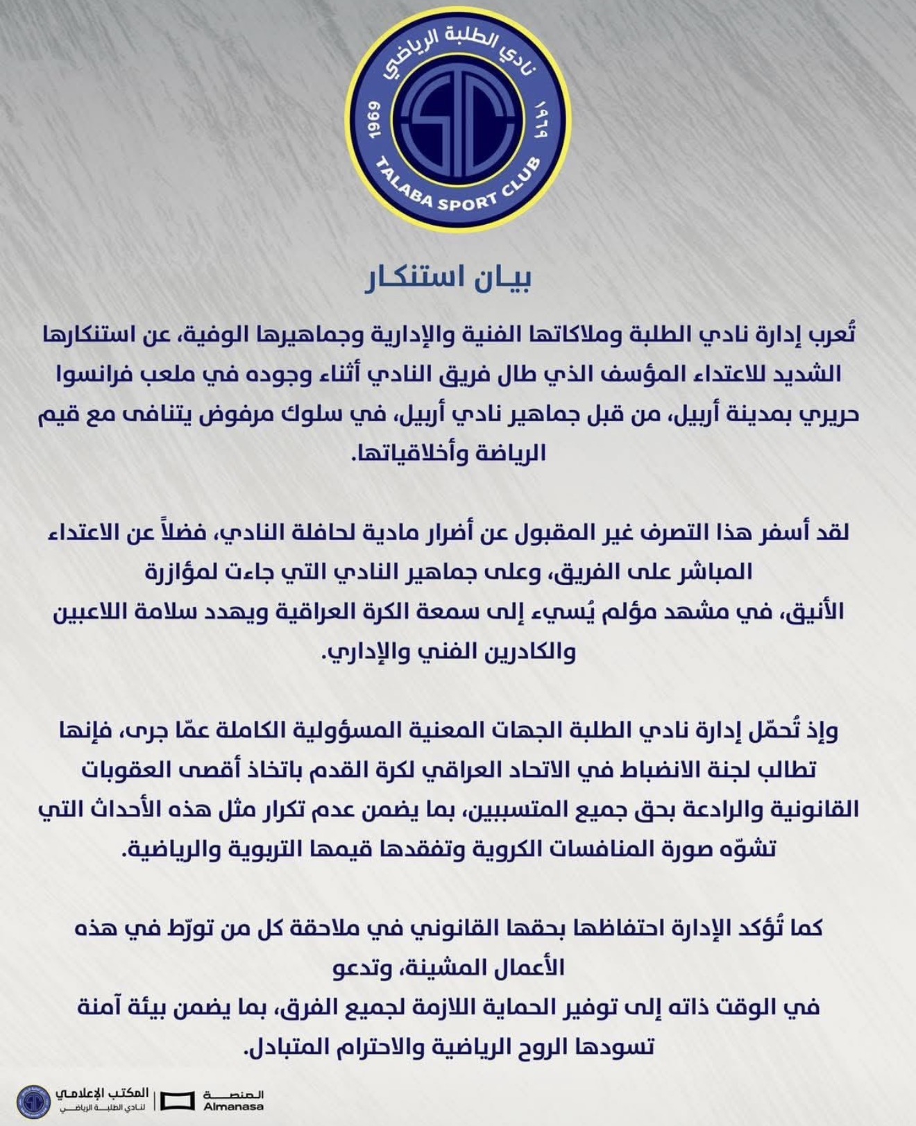 «مدیریت باشگاه الطلبه به همراه کادر فنی، اداری و هواداران وفادار خود، حمله شدید و تأسفبار صورتگرفته علیه اتوبوس تیم باشگاه را در جریان حضور تیم در ورزشگاه فرانسو حریری شهر اربیل، از سوی برخی از هواداران باشگاه اربیل، بهشدت محکوم میکند؛ رفتاری مردود که با ارزشها و اخلاق ورزش در تضاد آشکار است.
