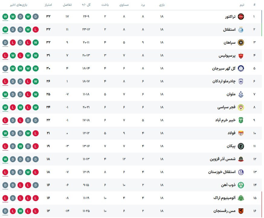 جدول لیگ برتر فوتبال ایران پس از پایان هفته هجدهم