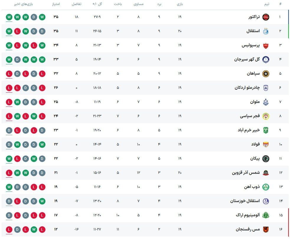 جدول لیگ برتر پس از پایان تک مسابقه امروز