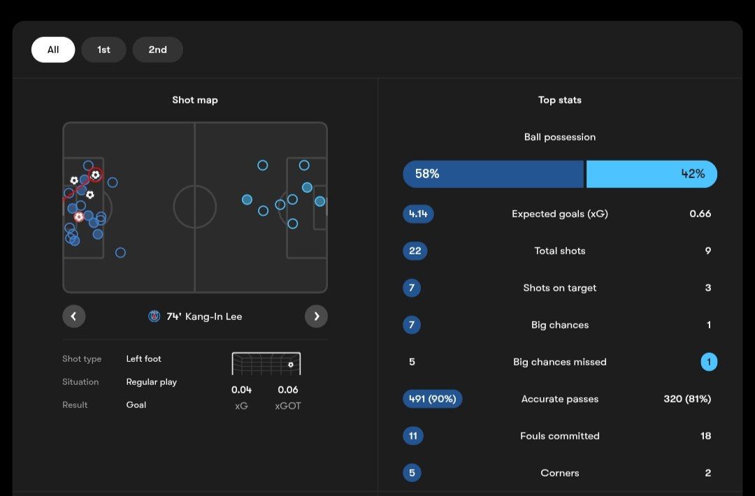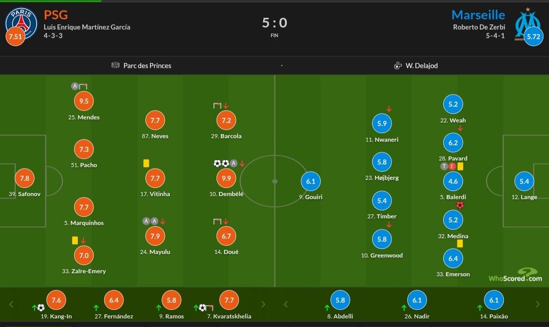 مارسی در دقایق کوتاه مالکیت خود، نمایش بسیار ضعیفی داشت و از ۷ شلیک به دروازه، نرخ امید گل ۰.۶۶ را ثبت کرد. در سوی دیگر، پاری سن ژرمن بیرحم، از ۶ ضربه در چارچوب خود ۵ بار به گل رسید و نرخ خیرهکننده امید گل ۴.۱۴ را به جای گذاشت. با این پیروزی، شاگردان لوئیس انریکه پیش از دیدار ۱۳ فوریه مقابل رن، به صدر جدول بازگشتند. مارسی نیز در جایگاه چهارم ماندنی شد تا چشم به بازی شنبه آینده برابر استراسبورگ بدوزد.