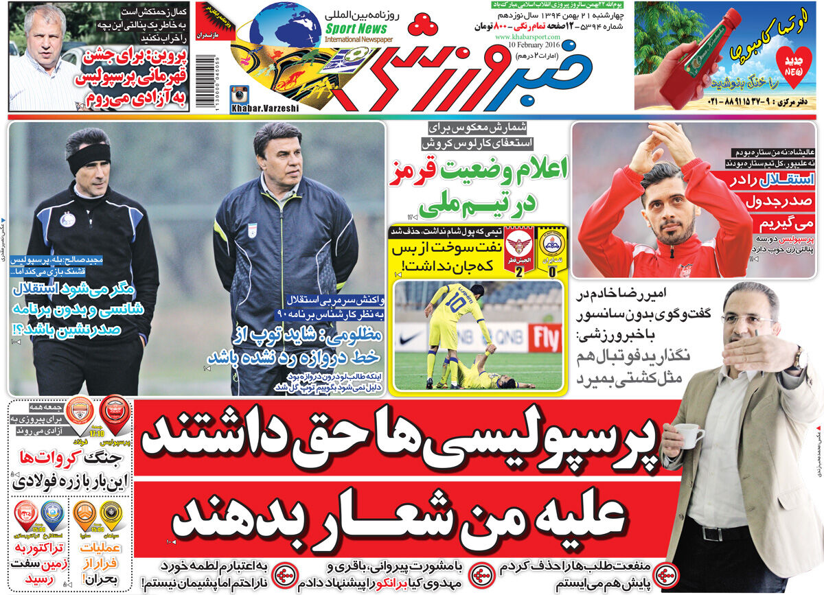 عکس جلد روزنامه خبرورزشی در تاریخ ۲۱ بهمن ۱۳۹۴ را ملاحظه میکنید.