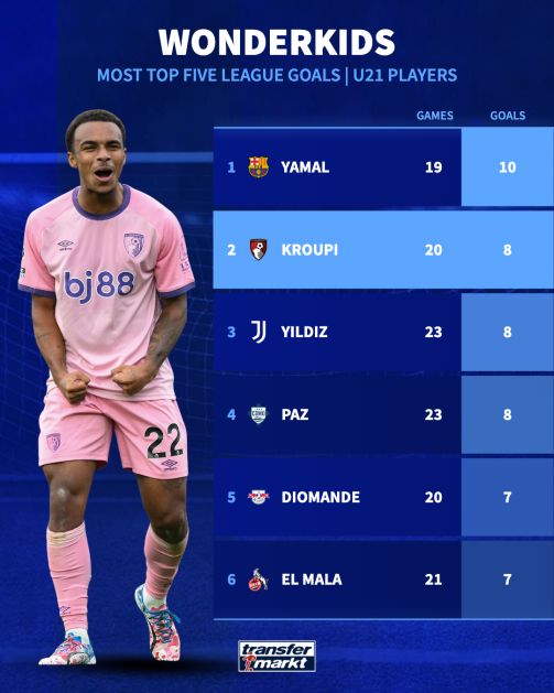 طرفداری | در حال حاضر، شاید تنها لامین یامال باشد که در آمار گلزنی بازیکنان زیر ۲۱ سال، بالاتر از او قرار میگیرد. الی جونیور کروپی بدون شک پدیده بیچون و چرای این فصل لیگ برتر انگلیس بوده و جای هیچ تعجبی نیست که ستاره نوظهور باشگاه بورنموث، اکنون در رادار بزرگترین باشگاههای جهان قرار گرفته است.