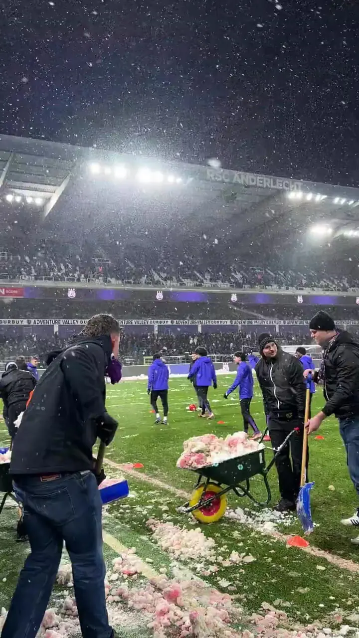 طرفداران پرشور اندرلخت و عوامل اجرایی مسابقه در اقدامی تحسینبرانگیز، برای جلوگیری از لغو بازی و پاکسازی سریع برف از سطح چمن، آستینها را بالا زدند.