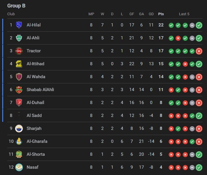 جدول لیگ نخبگان آسیا پس از پایان مرحله گروهی