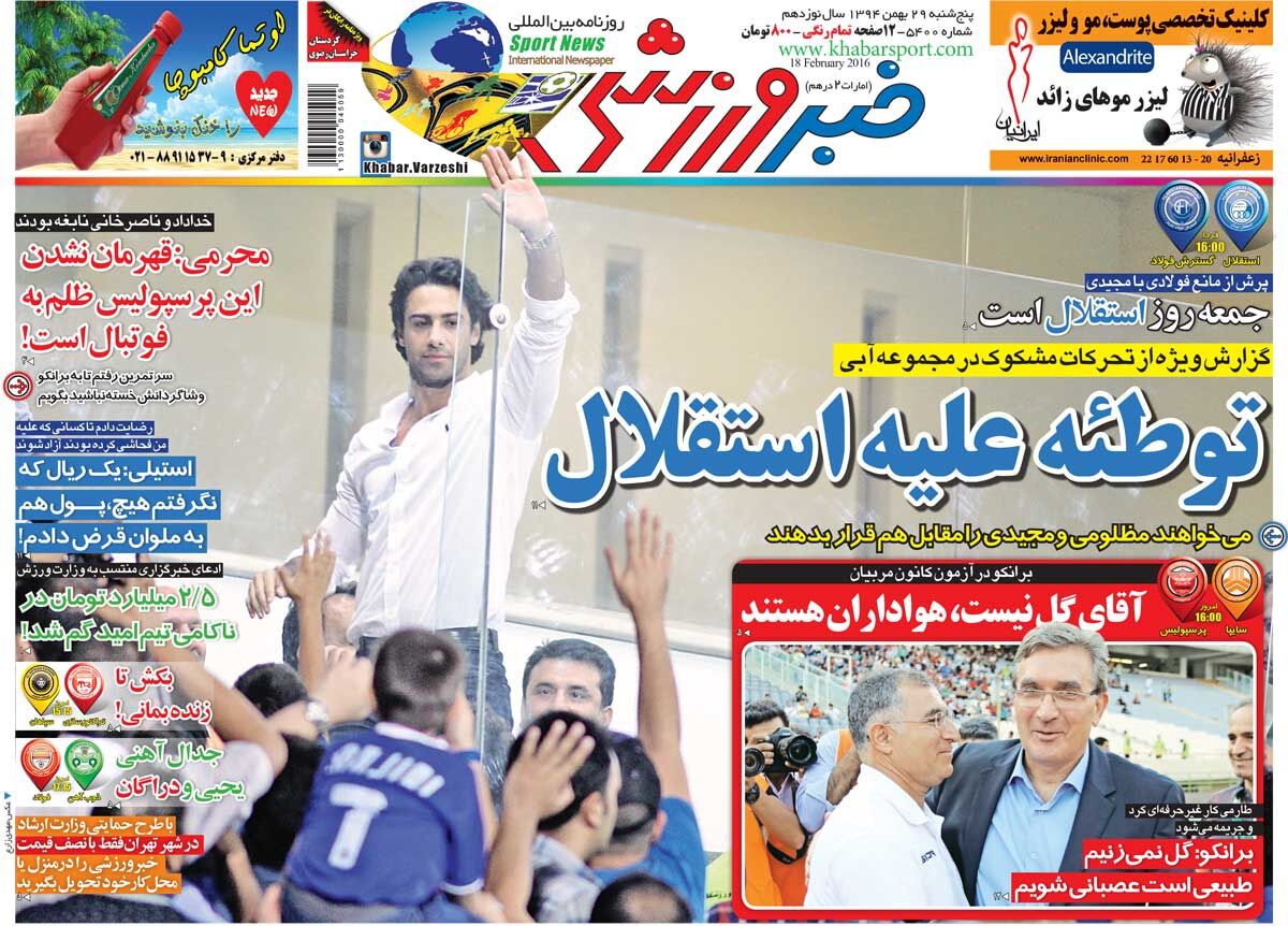 عکس جلد روزنامه خبرورزشی در تاریخ ۲۹ بهمن ۱۳۹۴ را ملاحظه میکنید.