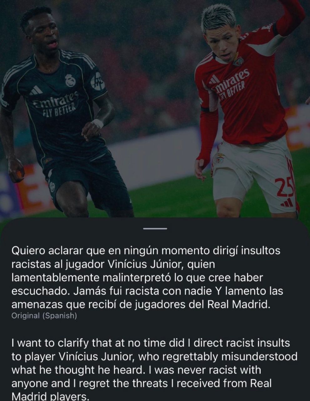 من هرگز با هیچکس رفتار نژادپرستانه نداشتهام و از تهدیدهایی که پس از این اتفاق از سوی بازیکنان رئال مادرید دریافت کردم، عمیقاً متأسفم.