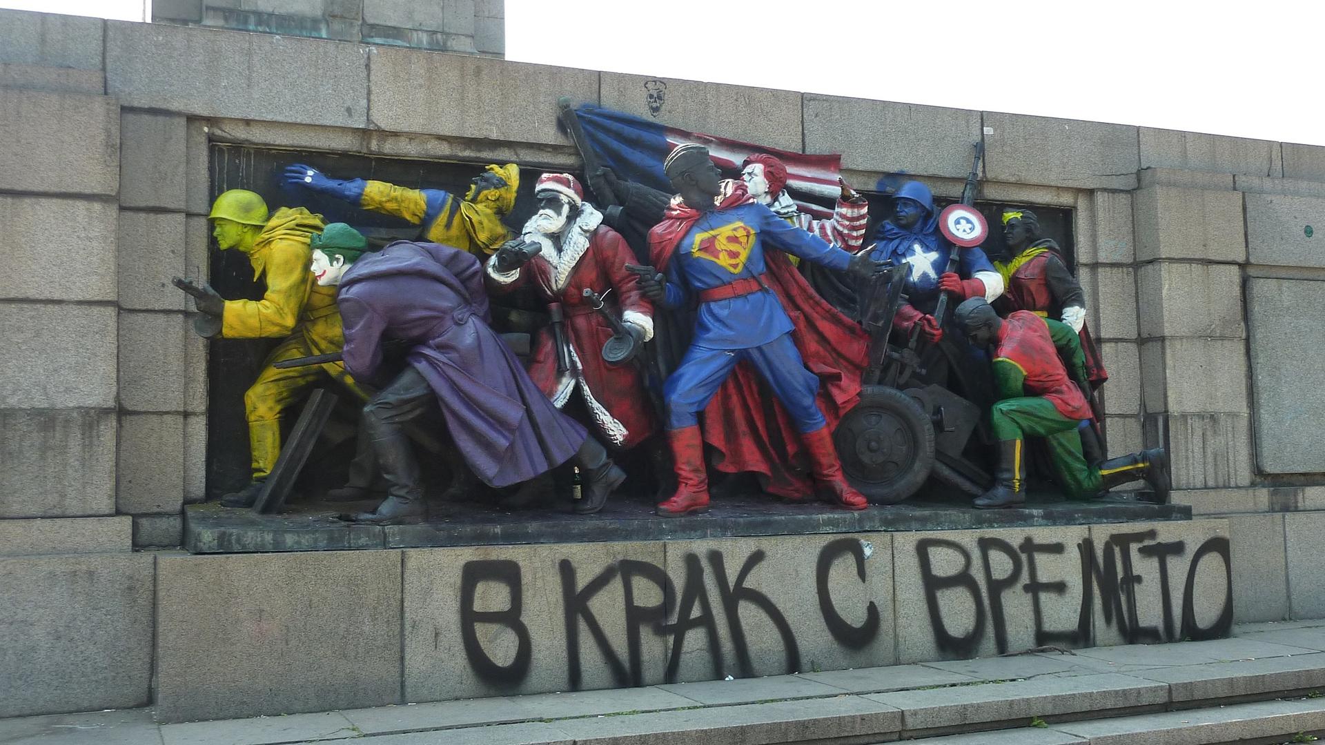 مجسمه یادبود ارتش شوروی در صوفیه، پایتخت بلغارستان، که توسط حزب کمونیست این کشور در سال ۱۹۵۴ بنا شد. عکس مربوط به سال ۲۰۱۱ است که گروهی از هنرمندان ناشناس در قالب یک هنر خیابانی یا حتی وندالیسم، افراد آن را به شخصیتهای محبوب فرهنگ پاپ آمریکایی و غربی تبدیل کردند. این رویکرد در سالیان اخیر بهوفور توسط چپ مسلکان برای جلب توجه جهانی در قبال مسائلی چون محیط زیست و حقوق اقلیتها به کار رفته است؛ جایی که به آثار هنری و تاریخی در موزهها، رنگ پاشیده میشود.