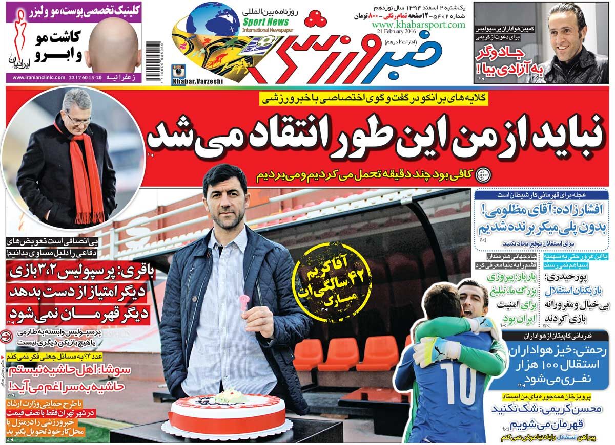 عکس جلد روزنامه خبرورزشی در تاریخ ۲ اسفند ۱۳۹۴ را ملاحظه میکنید.