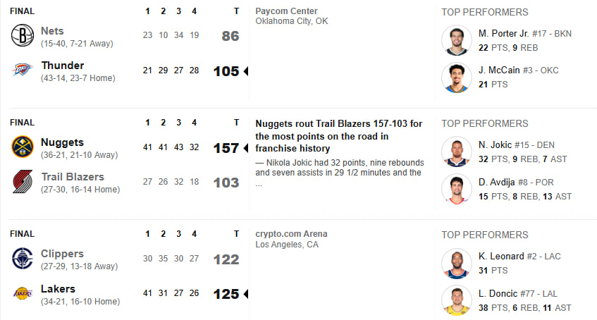 بین بازیکنانی که حداقل ۲۰ بازی مقابل لس آنجلس کلیپرز انجام دادهاند، لوکا دانچیچ بیشترین میانگین امتیازی را در طول تاریخ ثبت کرده است. میانگین لوکا مقابل کلیپرز با ۳۸/۸/۱۱ همراه با ۸ از ۱۴ سهامتیازیاش به ۳۱.۹ رسید! در جریان پیروزی لیکرز در دربی لس آنجلس، آستین ریوز هم ۲۹ امتیاز کسب کرد و برای پنجمین بازی متوالی، اسیستهای لبران جیمز دورقمی شد (۱۱،۱۲،۱۰،۱۰،۱۰).