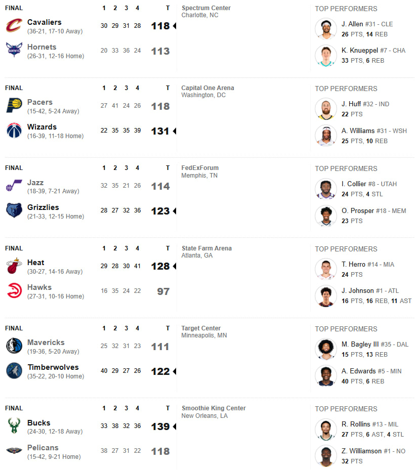 کان کنوپل (۳۳ امتیاز) با عبور از داناوان میچل پس از سهامتیازی زدن روی دست ستاره کلیولند، به رده دوم بیشترین سهامتیازی یک روکی در تاریخ لیگ رسید و تنها ۱۳ سهامتیازی تا شکستن رکورد کیگن موری (۲۰۶) فاصله دارد. کنوپل این فصل بیشترین سهامتیازی را ثبت کرده، بیشترین بازی با ۵+ سهامتیازی در تاریخ لیگ را از خوشد به جا گذاشته و ۲۵ بازی هم برای ارتقای رکوردهایش زمان دارد. البته برنده این بازی شارلوت و کوز، کلیولندیها بودند. جیمز هاردن و تیمش از زمان انجام آن ترید، رکورد ۰-۵ دارند. هاردن ۱۸ امتیاز و ۸ اسیست ثبت کرد و داناوان میچل هم ۳۲ امتیاز از خودش بهجا گذاشت.