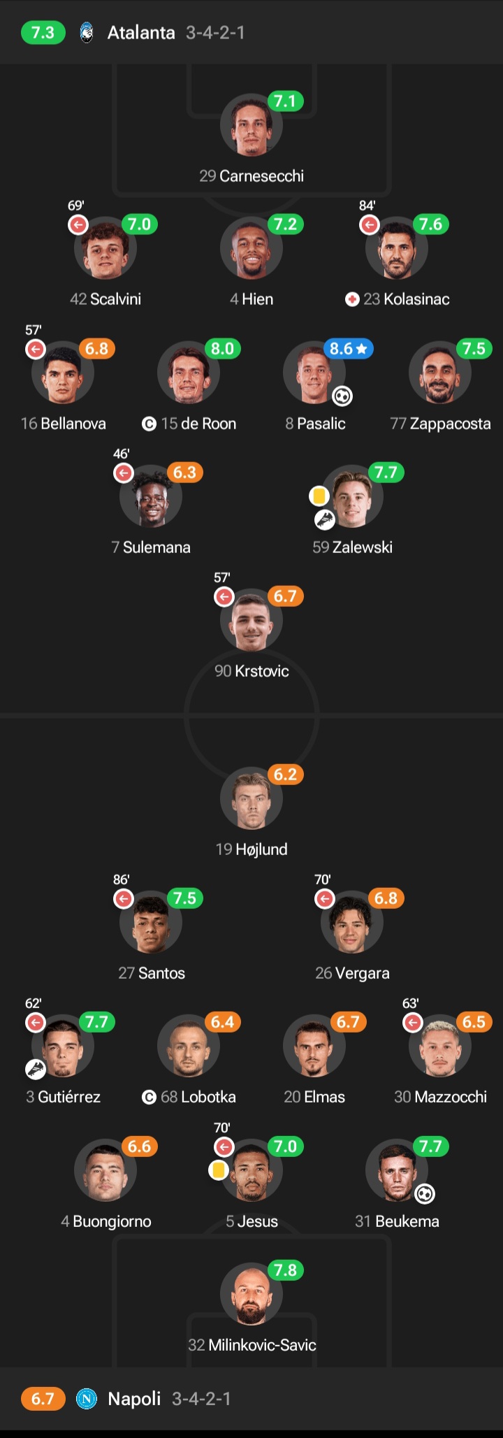 بوکما در دقیقه ۱۸ ناپولی را پیش انداخت اما آتالانتا در نیمه دوم جبران مافات کرد و با گلهای پاسالیچ در دقیقه ۶۱ و سامارژیچ در دقیقه ۸۱ ورق را برگرداند. با این پیروزی، آتالانتا ۴۷ امتیازی شد و به رتبه هفتم جدول صعود کرد. ناپولی هم ۵۰ امتیازی و در رتبه سوم باقی ماند.