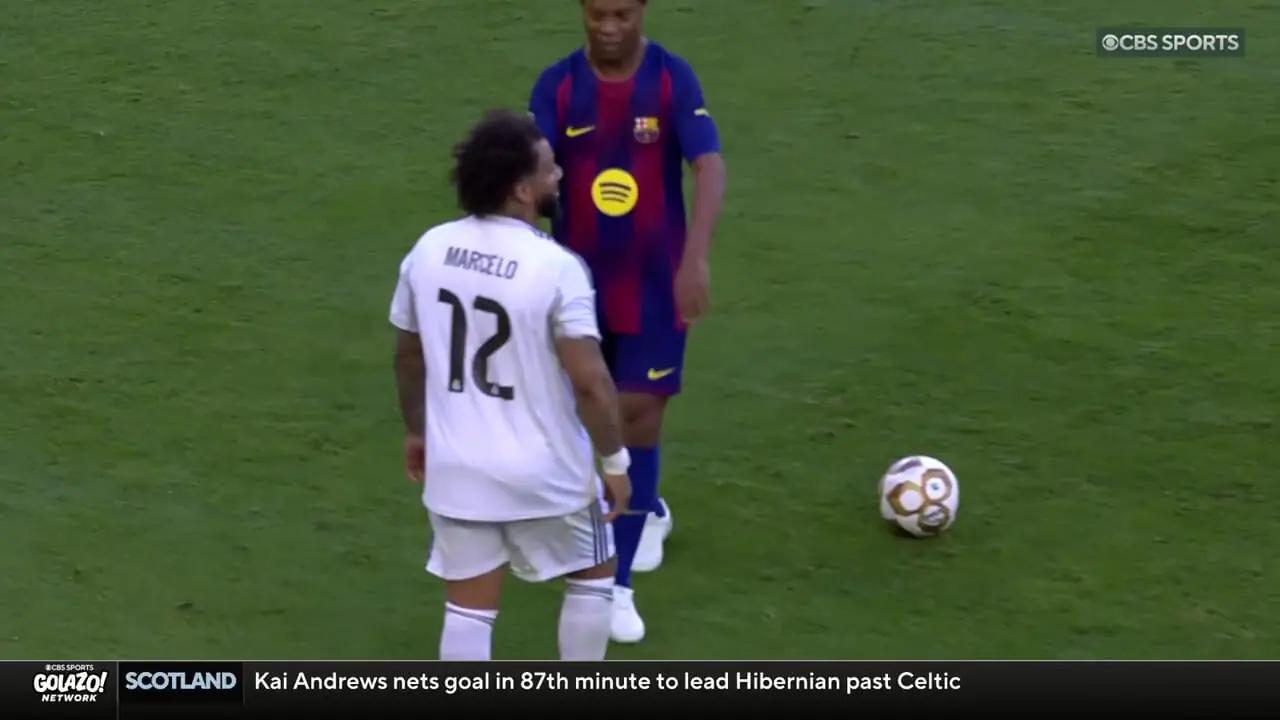 در حالی که توپ در زمین سپیدپوشان متوقف شده بود، مارسلو قصد داشت بازی را از منطقه خودی آغاز کند که ناگهان رونالدینیو از پشت سر ظاهر شد و ضربهای شیطنتآمیز به او زد. این حرکت بدون خشونت اما کاملاً هدفمند بود. مارسلو نیز با واکنشی اغراقآمیز، در حالی که دستهایش را باز کرده بود و چهرهای متعجب داشت، خودش را روی چمن انداخت تا یادآور تنشهای بالای الکلاسیکوهای قدیمی باشد.