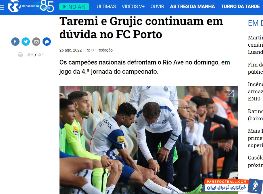در همین رابطه نشریه «sapo» پرتغال درباره آخرین وضعیت مصدومیت طارمی خبر داد پورتو فردا( یکشنبه) در دیداری از هفته چهارم رقابت های لیگ پرتغال به مصاف ریو آوه می رود.