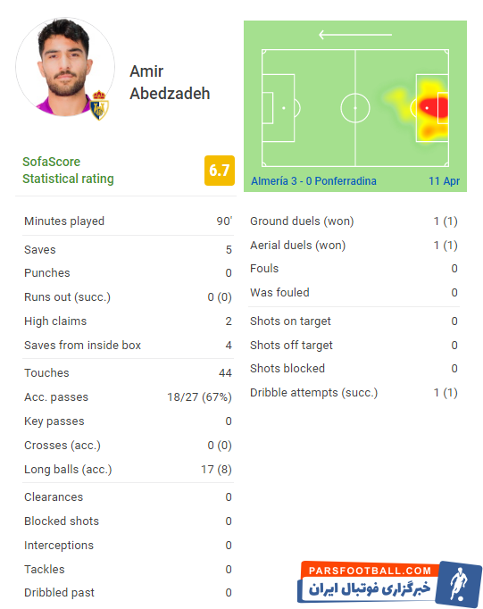 در این مسابقه امیر عابدزاده ۹۰ دقیقه درون دروازه بود و نتوانست مانع گل خوردن تیمش شود. با این حال دروازهبان کشورمان شب شلوغی را داشت و در این مسابقه ۵ سیو را به ثبت رساند تا به یکی از بازیکنان برتر تیمش نام گیرد.