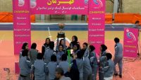 مراسم اهدای گل به تیم نایب قهرمان لیگ فوتسال زنان ورود تیم فوتسال زنان پیکان برای دریافت جام قهرمانی
